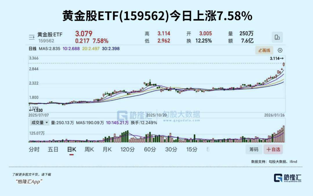 国内方面,2026年1月份尚未完竣,黄金ETF中原(518850)的涨幅仍是达到17.32%,近20个交易日获23.98亿元资金流入,最新限度达152.92亿元;素有“金价放大器”之称的黄金股ETF(159562)年内涨幅38.01%,近10个交易日吸金18.8亿元,限度增至57.94亿元。